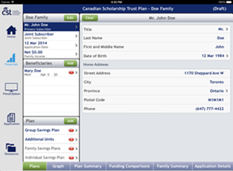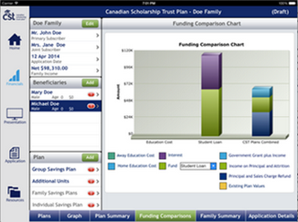 EPOS product allows CST reps to illustrate their RESP products to potential customers and aid the CST reps in completing an RESP application real-time and on-line. The customers them simply sign their signature to the electronic application and the encrypted and protected application reached CST head office to be processed instantly. This application is a major milestone in providing portable and error-free electronic application and new business delivery systems in the financial industry.